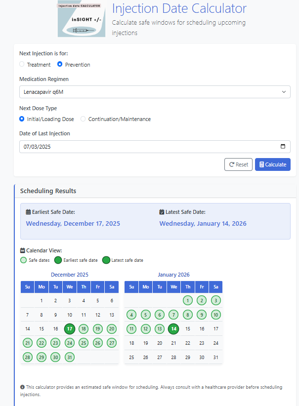 This status neutral safe injection date calculator is a reference tool to help providers pinpoint the start and end of the next injection window, and the “target” injection date.